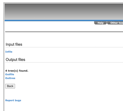 If all goes well, no error with the input file, then the output screen appears (Fig 3). If the page returns an error message, then the problem is most likely with the phylip format.