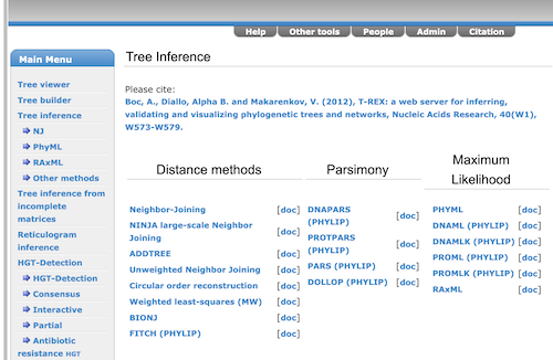 From trex, select tree inference, NJ for Neighbor Joining, and other, eg., PARS(PHYLIP) (Fig 1).